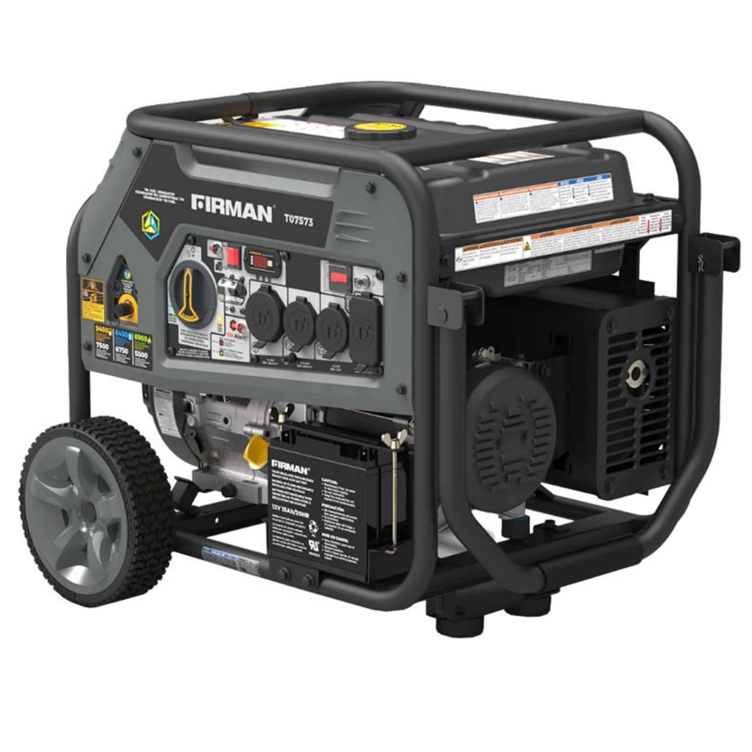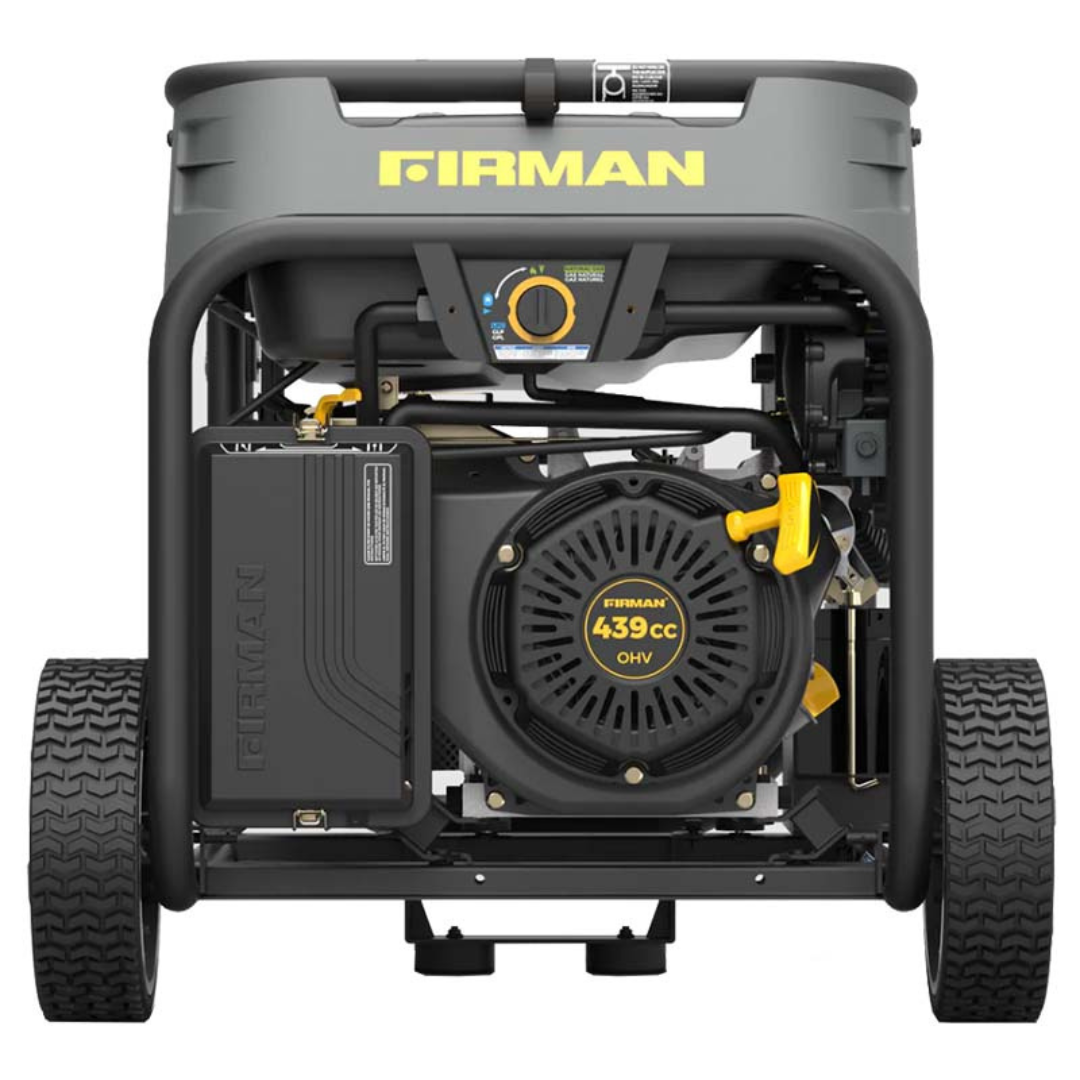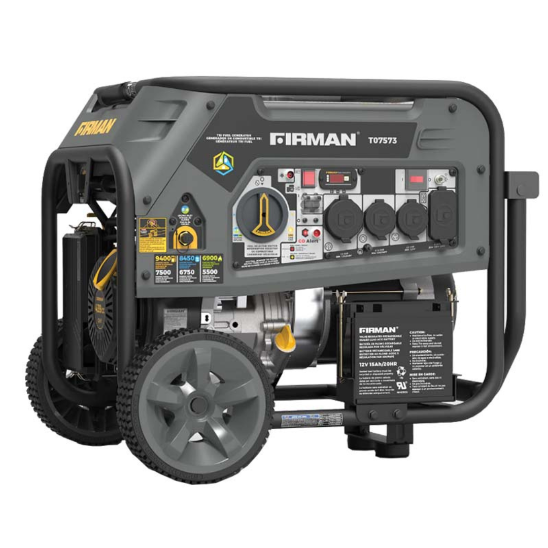 El generador portátil FIRMAN de 9400W ofrece arranque eléctrico y manual, con un motor de 439cc y tres tipos de combustible: gasolina, gas natural y gas propano. Tiene una potencia de 7500W en uso y 9400W en arranque, con salida 120/240V. Su tanque de 8 galones permite hasta 12 horas de funcionamiento, emitiendo 74 dB de ruido. Incluye panel multifunción, alerta de CO y ruedas para transporte.